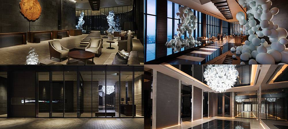 上段左 Brent Comber「Vein」<ロビー>、上段右 名和晃平「Fu / Rai」<ロビー>、下段左 松尾高弘「Phenomenon」<1Fエントランス>、下段右 松尾高弘「Prism Chandelier」<1Fエレベーターホール>(画像はイメージ)