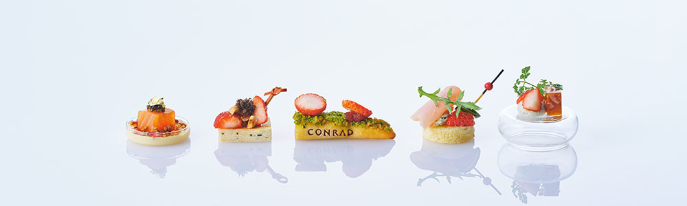 セイボリーには、インド由来のイギリスのカレー風味の炒めご飯、ケジャリーに、サーモン、キャビアと金箔を添えた「ケジャリーインスパイア―ドサーモンタルタル」や、 トリュフ香るチーズクリームを何層にも重ねて挟んだ「トリュフミルクレープ」、スペイン、カンタブリコ海域のアンチョビとフレッシュストロベリーの塩気と甘みが響きあう「カンタブリコアンチョビトースティー」、リッチな風味のブリオッシュにストロベリーを添えた「ブリオッシュオープンフェイス」、ビーフの旨味をゼリーに閉じ込め、ストロベリーをトップに飾った「デヴィルドビーフアスピック」など、最後の一口まで驚きと愉しみがつづく食体験をお届けします。