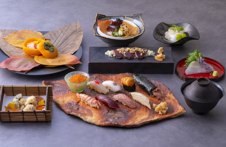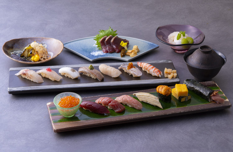 開放感と限られたお客様を迎えるのにふさわしいプライベート感を併せもつ和モダン空間で、季節を感じる日本料理と江戸前寿司をコース仕立てでご提供します。シャリに赤酢と白酢を合わせ、関西の伝統的な食文化も取り入れた江戸前寿司をメインに、美しく、趣向を凝らした日本料理お楽しみいただけます。
