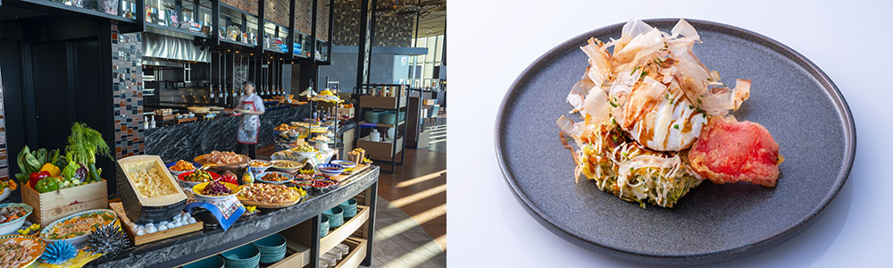 一日の始まりに素晴らしい眺望とともにお楽しみいただける朝食ビュッフェは、美味しさにこだわった約60種類のビュッフェに加え、シェフ特製の温かいお料理を1品お選びいただけるコンラッドスタイル。