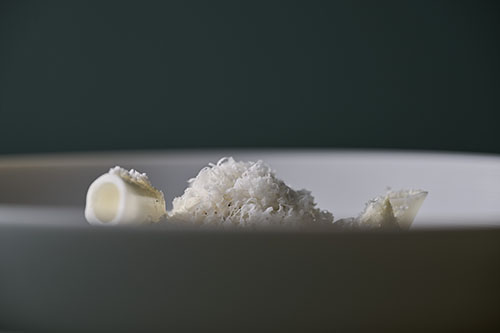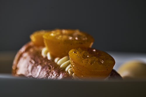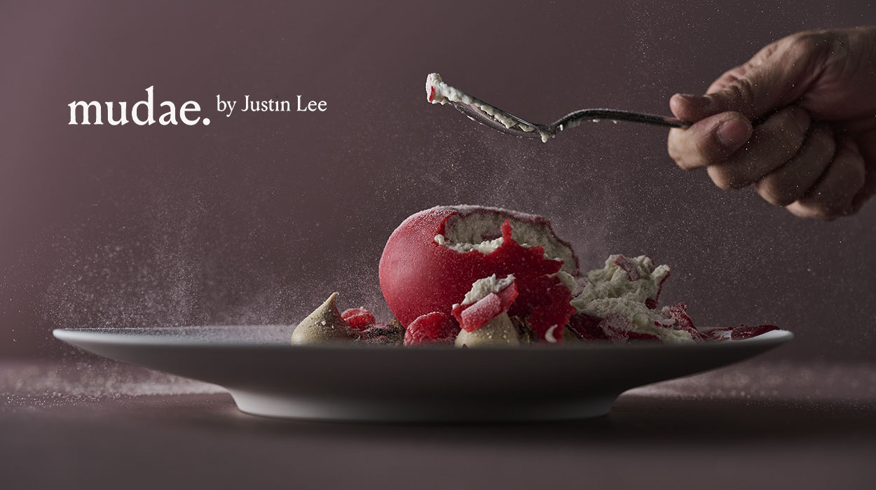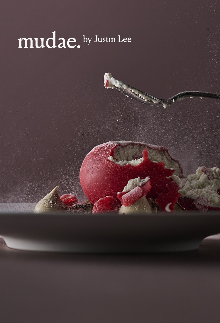 韓国語で「舞台」を意味する「ムデ(MUDAE)」と名付けられたスイーツバーは、韓国の気鋭パティシエ、ジャスティン・リー が手掛ける、スイーツを主役に展開するひとつの舞台。一皿をひとつのシーンに見立て、ストーリー仕立てで構成されるデザートコースは、味覚の常識を心地よく裏切る新たなスイーツ体験。馴染み深い食材が、まったく新しい姿と味わいへと変化していくプロセスは、スイーツとセイボリーというジャンルの境界に問いを投げかけます。